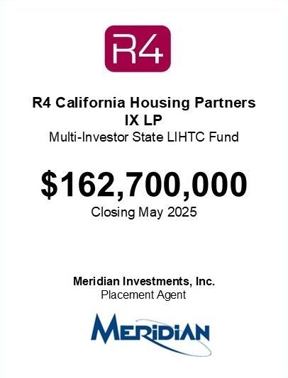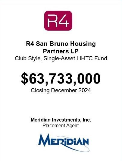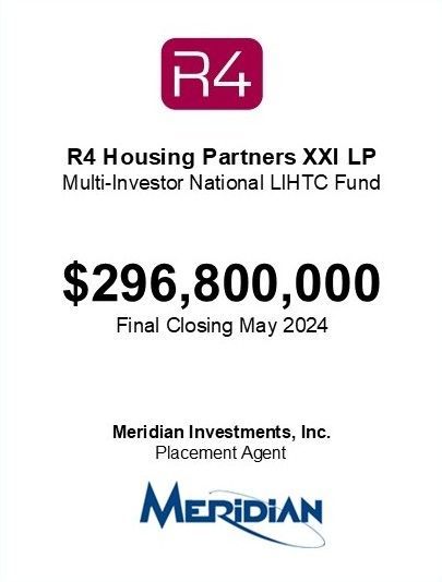 December 2025 Vienna, VA - Meridian Investments, Inc. is pleased to announce the final closing of R4 Housing Partners XXIV LP. R4 Housing Partners XXIV LP raised $344,000,000 of investor equity and will acquire interests in eighteen affordable multi-family rental properties located in sixteen states: Connecticut, Florida, Illinois, Maryland, Maine, Michigan, New Jersey, New Mexico, North Carolina, Ohio, South Dakota, Tennessee, Texas, Virginia, Washington and Wisconsin. Twelve corporations invested in the fund. Ten of the twelve investors have invested in prior R4 offerings. R4 Housing Partners XXIV will result in the creation and preservation of 2,711 affordable housing units for families and seniors. Units within the fund have set asides for extremely low-income households, families that have individuals with disabilities, single parents, or at risk of homeless individuals. Investor demand allowed for the R4 Housing Partners XXIV LP equity raise to increase above its original $305,000,000 offering amount. The closing of R4 Housing Partners XXIV LP increases R4 Capital’s LIHTC equity AUM to over $6.3 billion with over 140 investors. About Meridian Investments, Inc. Meridian Investments, Inc., a FINRA registered broker dealer founded in 1981.